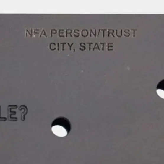 National Firearms Act Markings or better known as NFA Marking, is a government-required compliance marking for individuals, trusts, or legal entities that initially created the NFA firearm. San Antonio Laser Engraving meets this marking requirement.