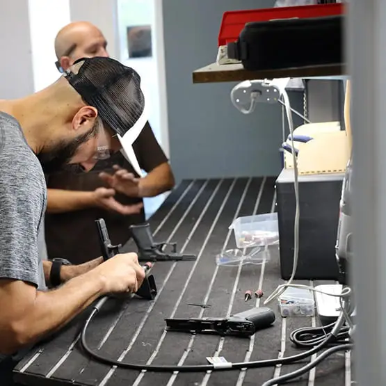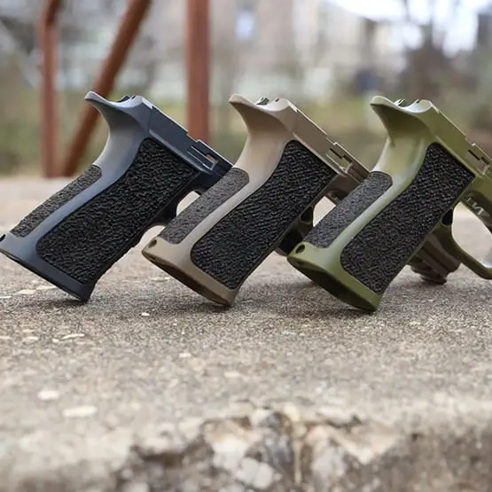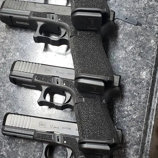 Removing the finger groove on a pistol is a great way to make your gun feel better to hold. We remove the factory groove and replace it with laser etched grip stippling. Additionally, we can leave in tact the actual grooves and sand them out. Then we apply new laser stippling.
