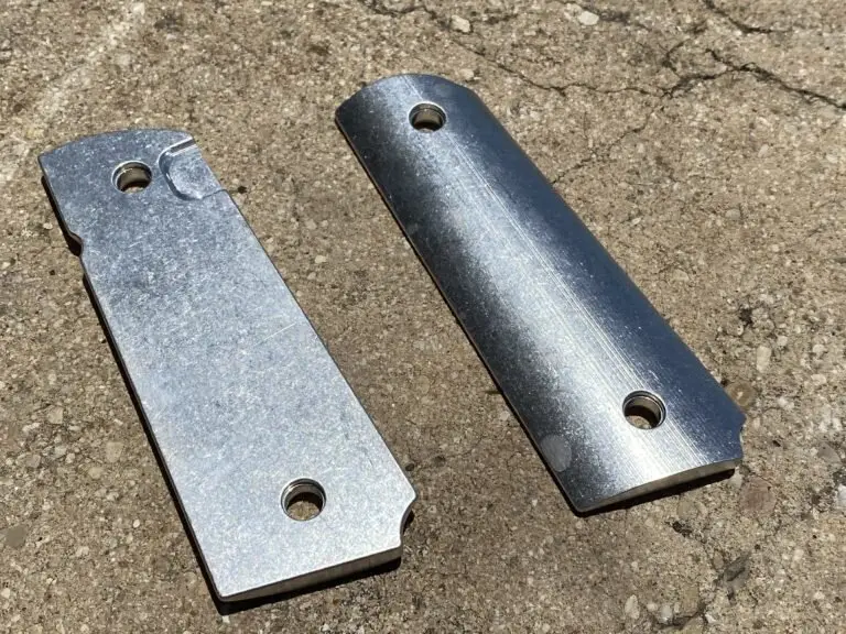 Specifications: Constructed from American-made 6061 aircraft grade aluminum, these grips come in raw aluminum finish. They are designed with an ambi cut for added convenience and are compatible with any full-sized mil-spec 1911.