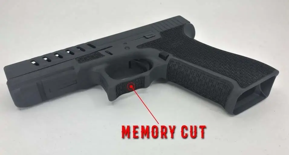 A memory cut is the second part of a notorious “double undercut” on modern era polymer frame firearms. This cut provides a reference point for the support hand/knuckle. This modification is not allowed in a lot of competition shooting.