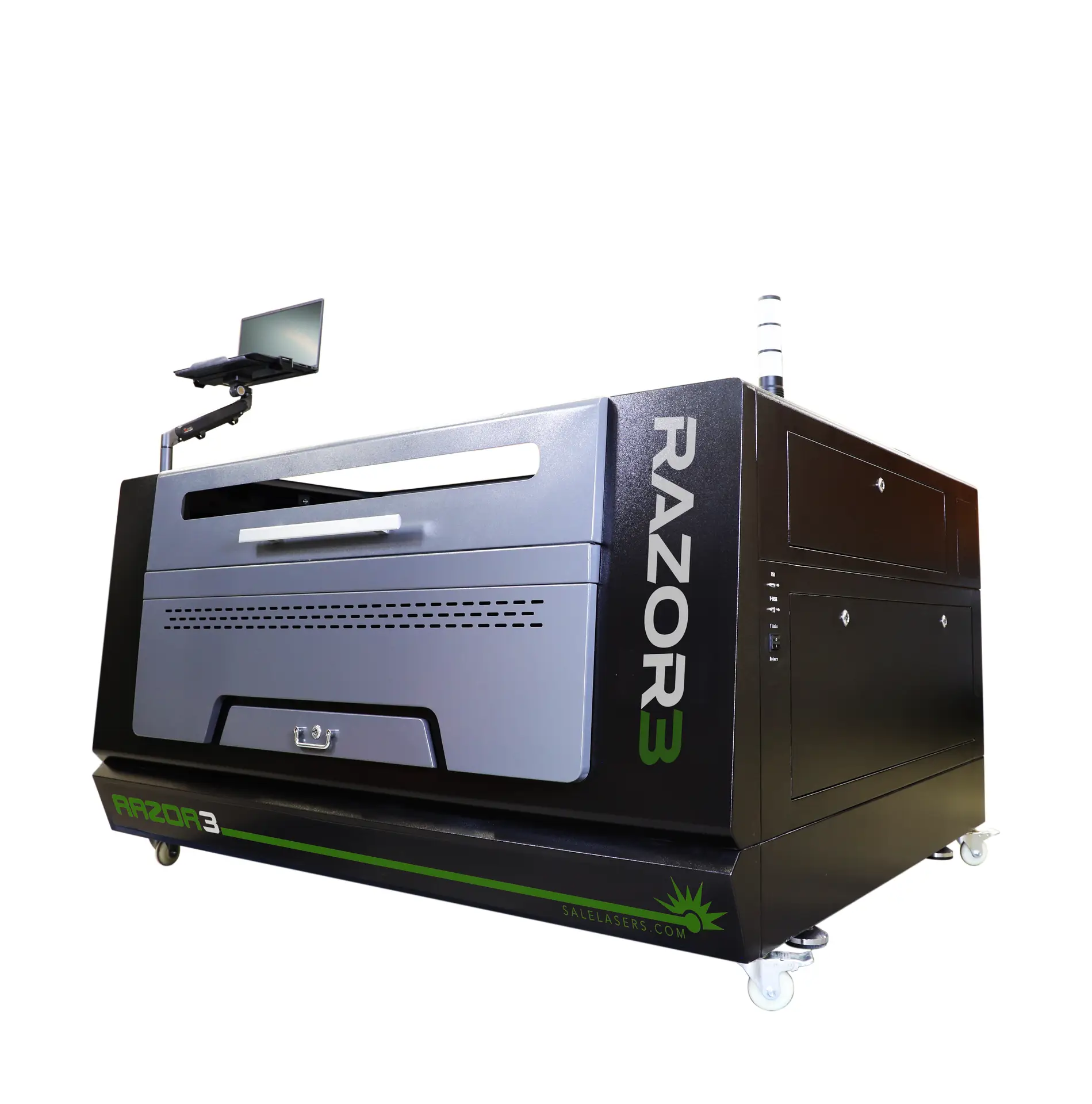 The SA Laser’s Razor 3 is a top-tier CO2 laser cutter and engraver ideal for both novices and professionals. It significantly outpaces traditional models with a 4X speed increase, enhanced by features like DC brush-less servo motors and HIWIN Synch-Motion Technology Rails. It’s versatile, with a 73cm 3-jaw rotary, air assist pump, CW5200 chiller, and 550W exhaust. User-friendly with a wireless controller and LED illuminated workbed, it’s backed by a robust 2-year US warranty, making it a smart choice for anyone serious about laser cutting and engraving. Each system comes equipped with Lightburn software, air assist, servo motors, a 5200 Series chiller, a pass thru door system, an integrated touchpad, an illuminated work bed, a stack light, and a full supply kit.